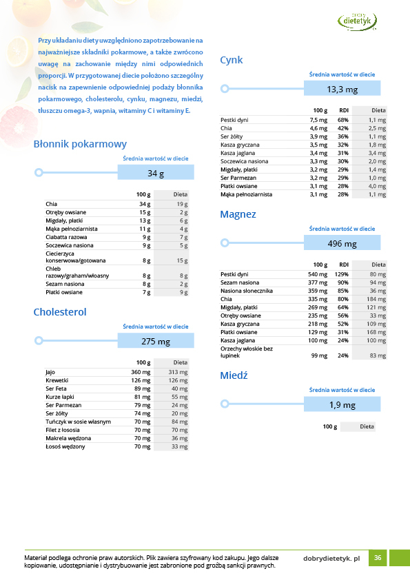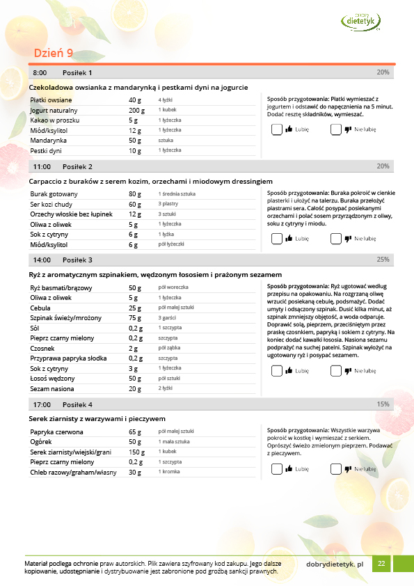Dodatkowo do opracowanego planu dietetycznego otrzymasz atrakcyjnie przygotowane ciekawostki i wiadomości żywieniowe, które mam nadzieję pozwolą Ci zrozumieć wiele spraw związanych z nurtującym Cię problemem, a także przyczynią się do zwiększenia ogólnej wiedzy żywieniowej.